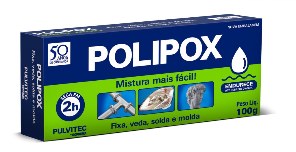 Massa epóxi Polipox é um composto adesivo de alta resistência usado para reparos, colagens e preenchimentos, aderindo firmemente a diversos materiais após a cura completa.
